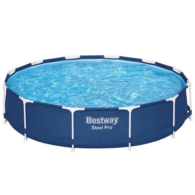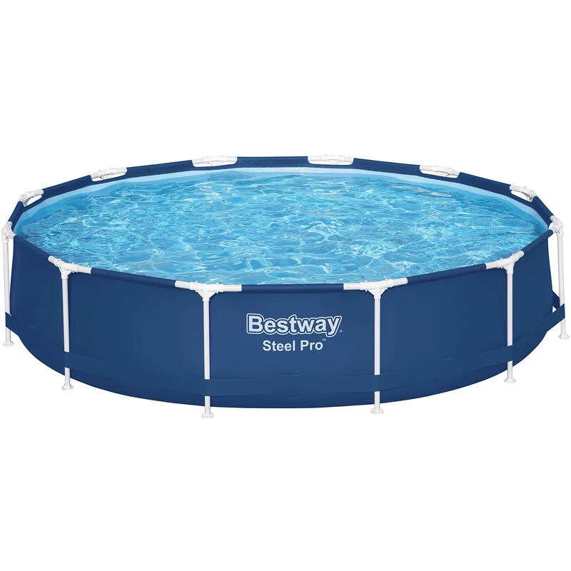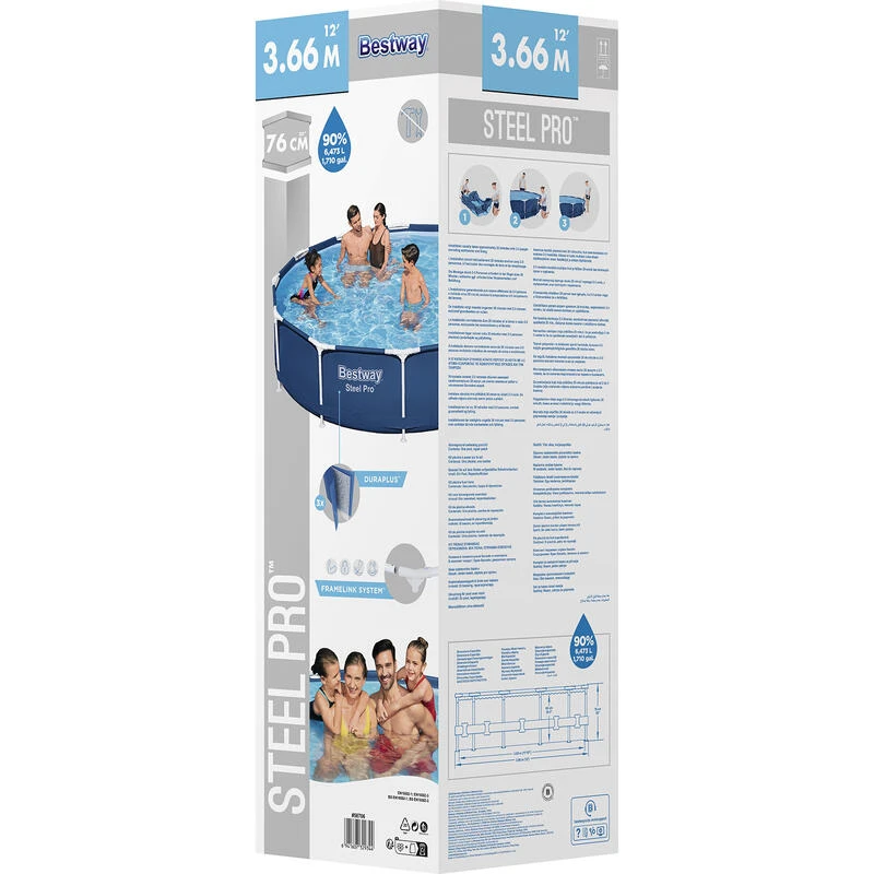 *Piscine ronde hors sol *Diamètre : 366 cm *Hauteur : 76 cm *Capacité d’eau : 6473 litres *Matériau de la piscine : DuraPlus *Matériau du cadre : acier résistant à la corrosion *Vanne de vidange *Patch de réparation inclus *Couleur : bleu foncé à l’extérieur et bleu clair à l’intérieur *Marque : Bestway *Série : Steel Pro *Possibilité de raccorder un système de filtration (Ø 32 mm) *Ne convient pas à un usage commercial *Ne pas laisser les enfants jouer dans la piscine sans surveillance