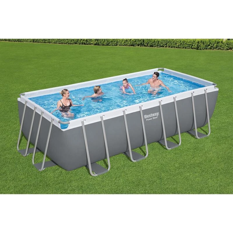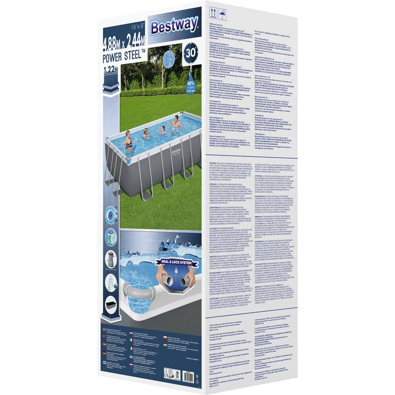 *Piscine hors sol à cadre rectangulaire avec pompe de filtration et marches d’escalier *Dimensions intérieures : 488 x 244 x 122 cm (L x l x h) *Dimensions extérieures : 527 x 284 cm (L x l) *Capacité d’eau : 11,532 litres *Matériau de la baignoire : TriTech *Matériau du cadre : acier résistant à la corrosion *Pompe à filtre FlowclearTM avec cartouche filtrante de type II incluse *Capacité du filtre 3,0 m³/h *Diamètre du tuyau 3,2 cm *Vanne de vidange *Comprend un escalier Flowclear d’une hauteur de 122 cm avec 8 marches. *Y compris patch de réparation *Couleur : gris à l’extérieur, avec aspect mosaïque à l’intérieur *Marque : Bestway *Série : Power Steel *Ne convient pas à un usage commercial
