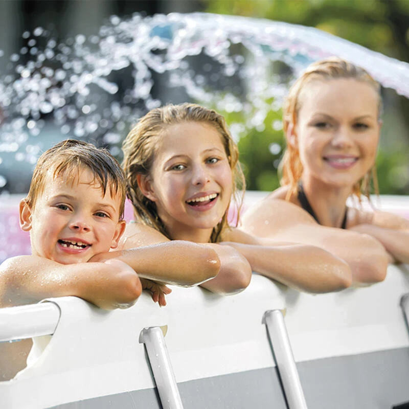 Piscine tubulaire rectangulaire Intex, idéale pour passer un été au frais. Baignades, amis et famille, ce cocktail vous fera passer un été inoubliable.La piscine tubulaire rectangulaire Prism Frame e
