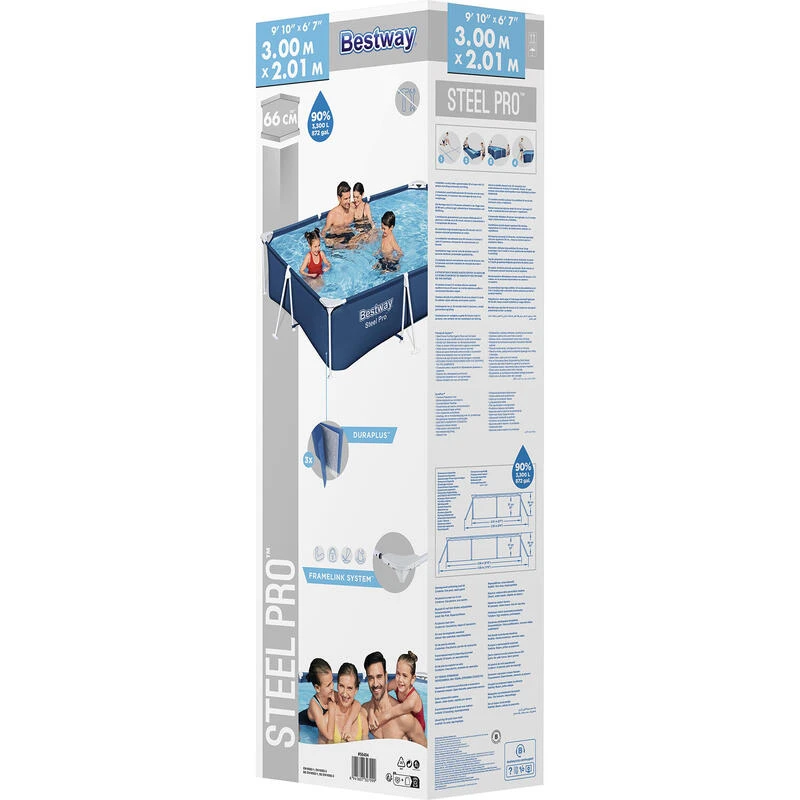 *Piscine hors sol à cadre rectangulaire *Dimensions intérieures de la piscine : 300 x 201 cm *Dimensions extérieures de la piscine : 355 x 255 cm *Hauteur : 66 cm *Capacité d’eau : 3300 litres *Matériau de la piscine : DuraPlus *Matériau du cadre : acier résistant à la corrosion *Vanne de vidange *Pièce de réparation incluse *Couleur : bleu foncé à l’extérieur et bleu clair à l’intérieur *Marque : Bestway *Série : Steel Pro *Possibilité de raccorder un système de filtration (Ø 32 mm) *Ne convient pas à un usage commercial *Ne pas laisser les enfants jouer dans la piscine sans surveillance